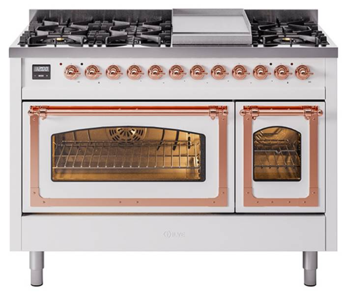 Introducing the new Nostalgie II 48" dual fuel range, a classic addition with a touch of innovation to any kitchen. This range feature sealed burners equipped with total black brass burner that has a non-stick nanotechnological coating, heavy cast iron grates, 3.5 + 1.52 cu. ft. total double oven capacity and soft closing door system.Read More