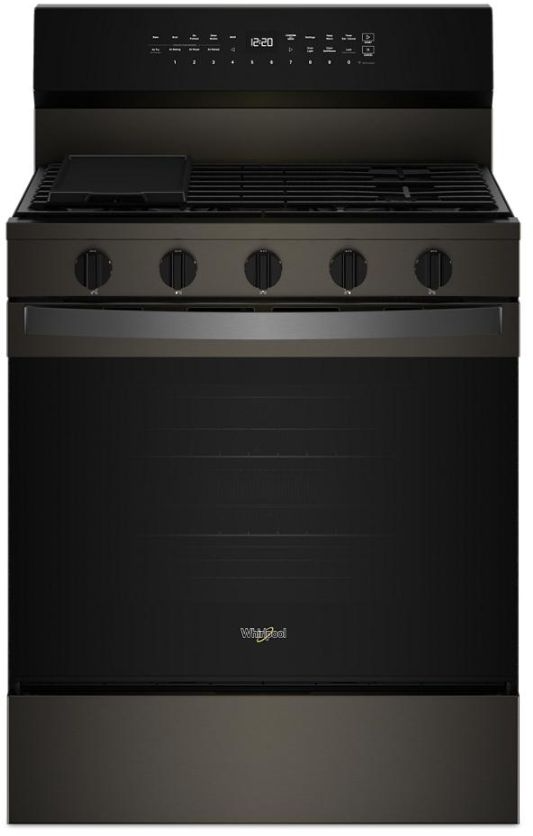 Whirlpool® 30" Black-on-Stainless Freestanding Gas Range features SpeedHeat™ Burner, Air Cooking Technology, EZ-2-Lift™ Hinged Cast-Iron Grates, No Preheat Air Fry, Steam Clean, No Preheat Mode, Griddle Zone, and Keep Warm Setting.Read More