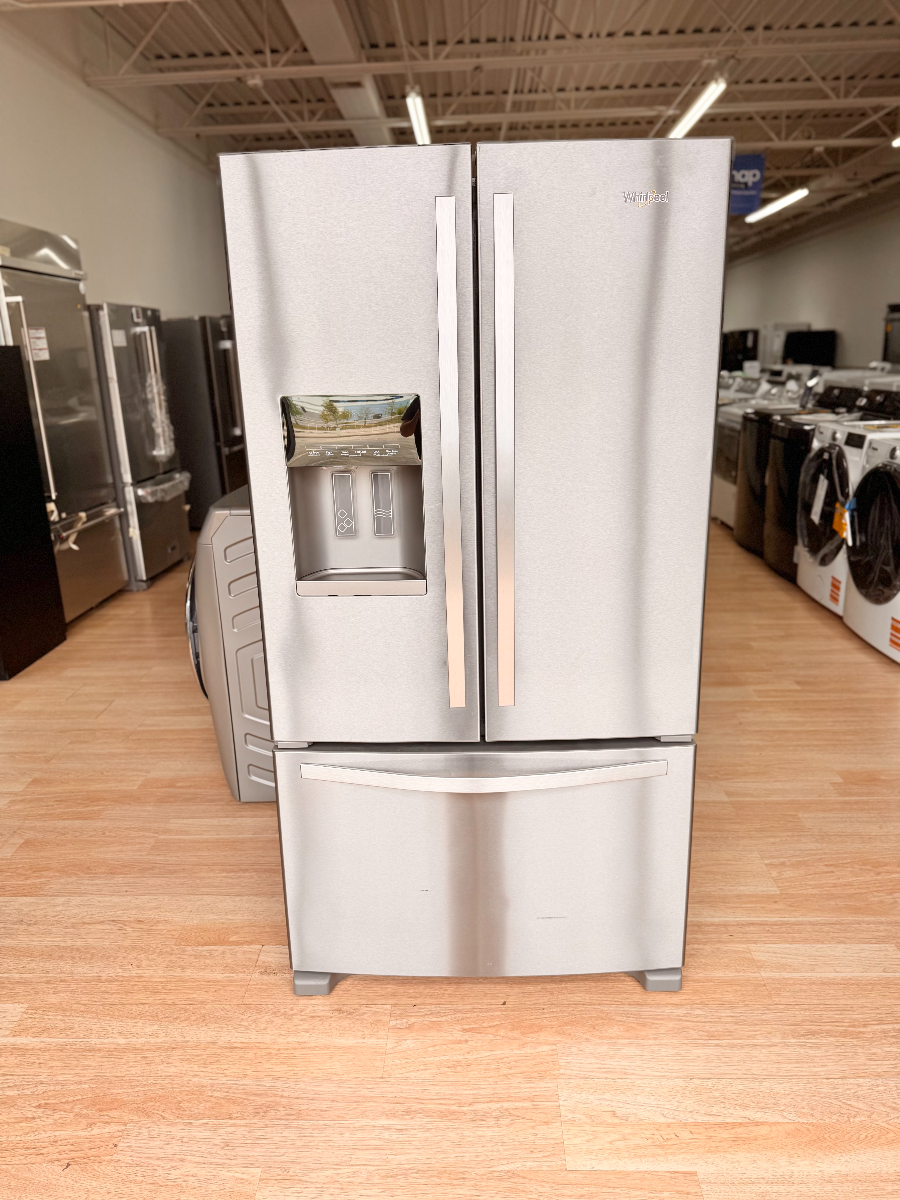 Organize foods for your family in this Whirlpool® French door refrigerator available in fingerprint-resistant stainless steel. A humidity-controlled double crisper and two-tier freezer storage provide plenty of room. Spillproof shelves help contain spills and for filtered water right at hand, this refrigerator features an exterior water dispenser with EveryDrop® ice and water filtration.Read More