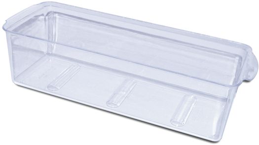 Clear container keeps small, refrigerated or frozen items organized or stores extra ice.